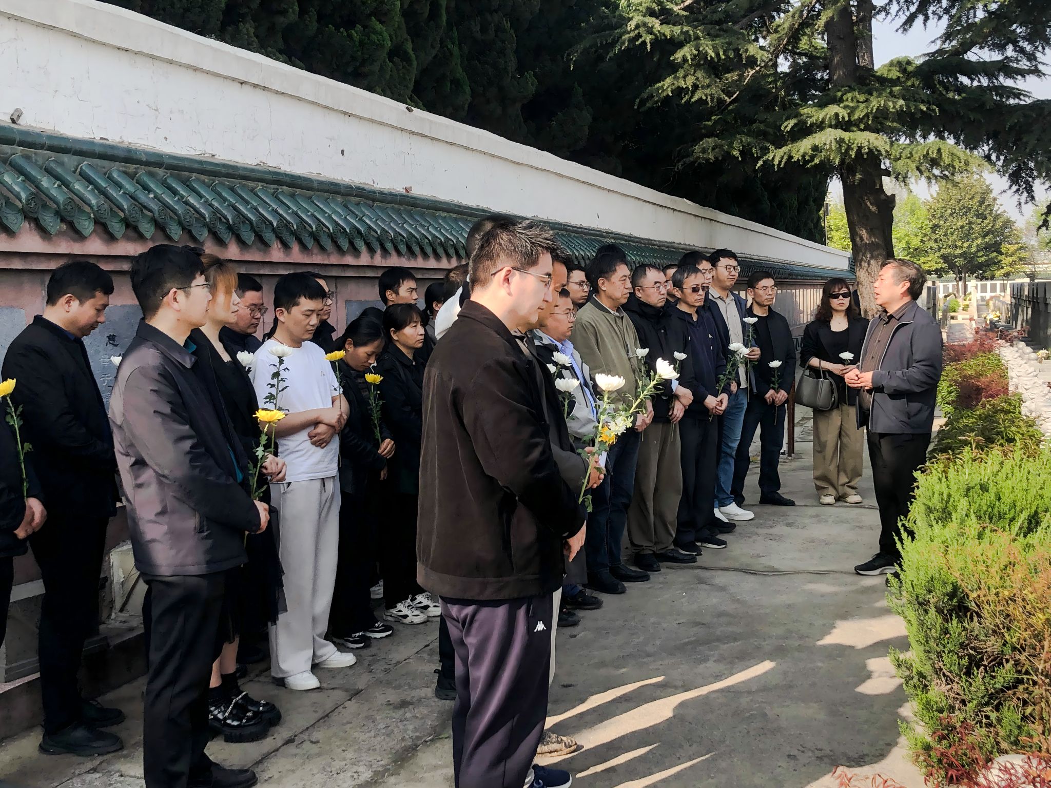 活动最后,在场师生整齐列队,依次向三位先生的墓碑三鞠躬并敬献鲜花。一束束黄白相间的鲜花,寄托着学院师生对先贤的崇高敬意与深切缅怀。