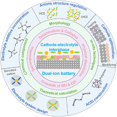 本综述首先简要介绍双离子电池的发展历程及其正极电解质界面的形成和演化过程。随后,系统讨论了正极电解质界面的先进表征技术,并重点阐述了通过调控形貌、组分及反应机制等优化正极电解质界面的代表性策略。最后,针对当前研究面临的挑战和未来发展方向进行展望。本综述为解析正极电解质界面的组成、结构及动态演化规律提供重要指导,为构建兼具高稳定性和高离子电导率的正极界面结构指明方向。