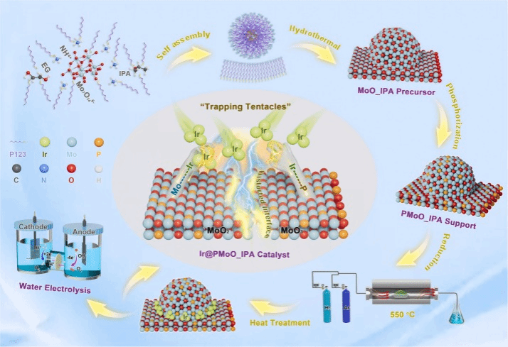 本研究通过磷元素调制钼界面,并借助晶格工程策略实现了对铱位点的有效锚定,进而开发出一种高效稳定的水分解催化剂。磷的引入诱导产生晶格应变,进而形成稳定的铱-钼键与铱-磷共价键。这些强键合作用不仅有效抑制了铱颗粒的团聚,还优化了反应中间体的吸附行为,并增强了在酸性介质中的抗腐蚀性能。实验结果表明,所制备的催化剂在酸性与碱性环境中均表现出优异的电解水活性。这一晶格工程策略为可持续制氢领域的高性能催化剂设计提供了新思路。