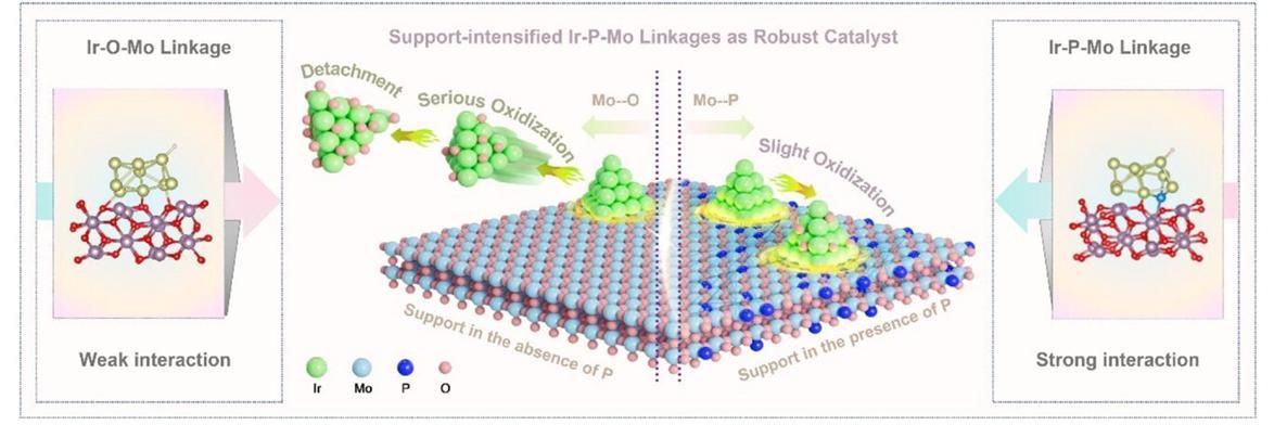 近日,梅俊教授课题组在国际知名期刊《Advanced Science》上发表题为“Support-Intensified Ir-P/O-Mo Cooperative Linkages for Robust Acidic Water Dissociation”的研究性论文。