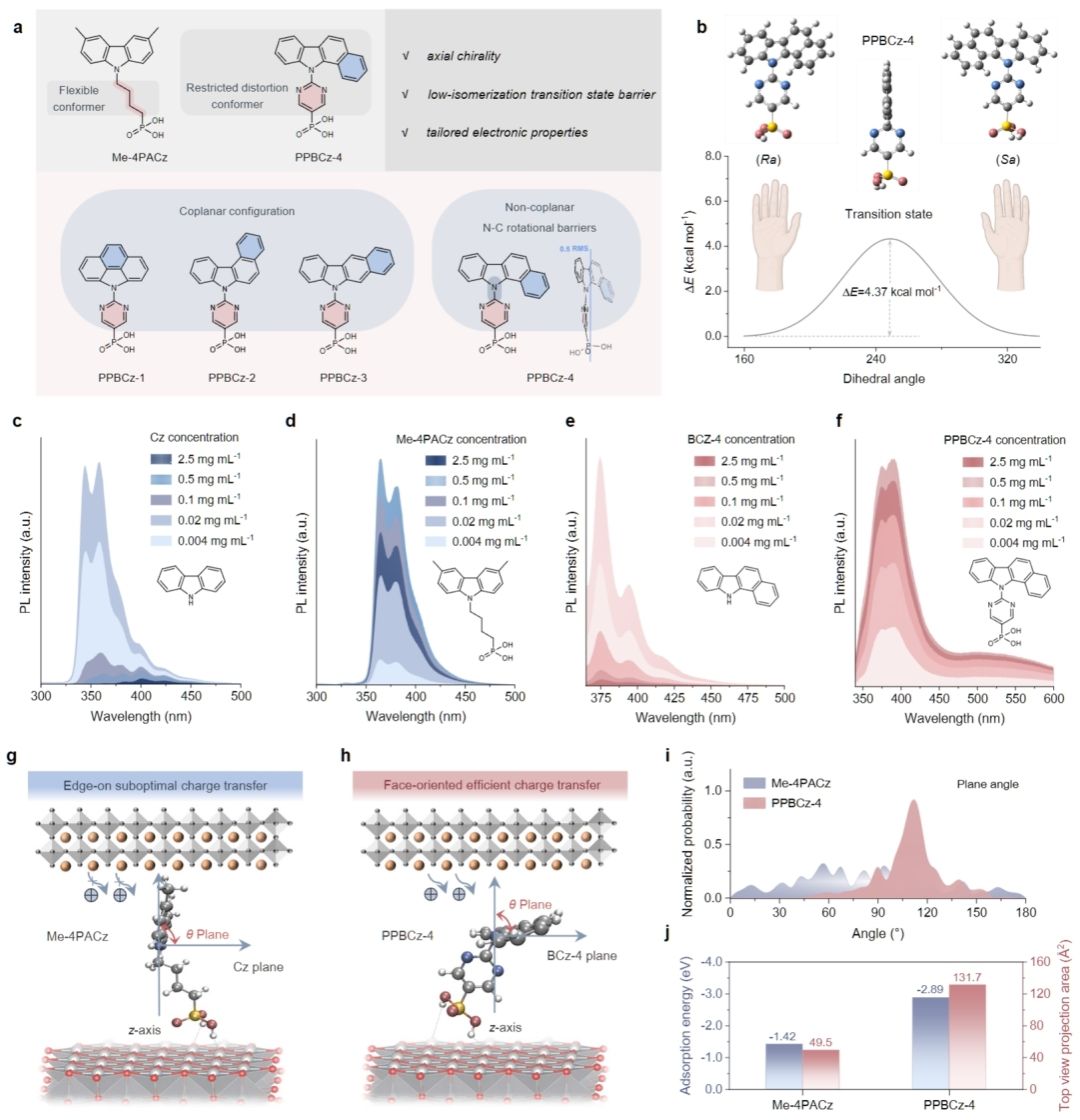 图1:(a)分子空穴选择性接触的构型设计思路;(b)轴向手性分子 PPBCz-4 的旋转能垒曲线;(c)Cz、(d)Me-4PACz、(e)BCz-4及(f)PPBCz-4分子的浓度依赖型荧光光谱;基于AIMD模拟,(g)Me-4PACz与(h)PPBCz-4的π共轭端基平面法向量与z轴夹角示意图(衬底为NiOx);(i)Me-4PACz与PPBCz-4的平面夹角概率分布;(j)Me-4PACz与PPBCz-4在NiOx表面的吸附能,及从俯视图提取的对应分子占据面积。