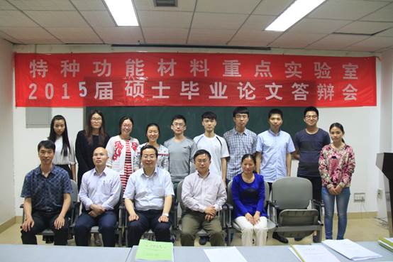 5月15、16日特种功能材料重点实验举行2015届研究生毕业论文答辩会,答辩会分为三楼学术报告厅、二楼学术报告厅两个会场。参加此次答辩会的校外专家有北京理工大学邹炳锁教授、郑州大学李新建教授、李中军教授、河南师范大学杨宗献教授及河南大学特种功能材料重点实验室的部分专家、教授,实验室全体导师及研究生参加了答辩会。