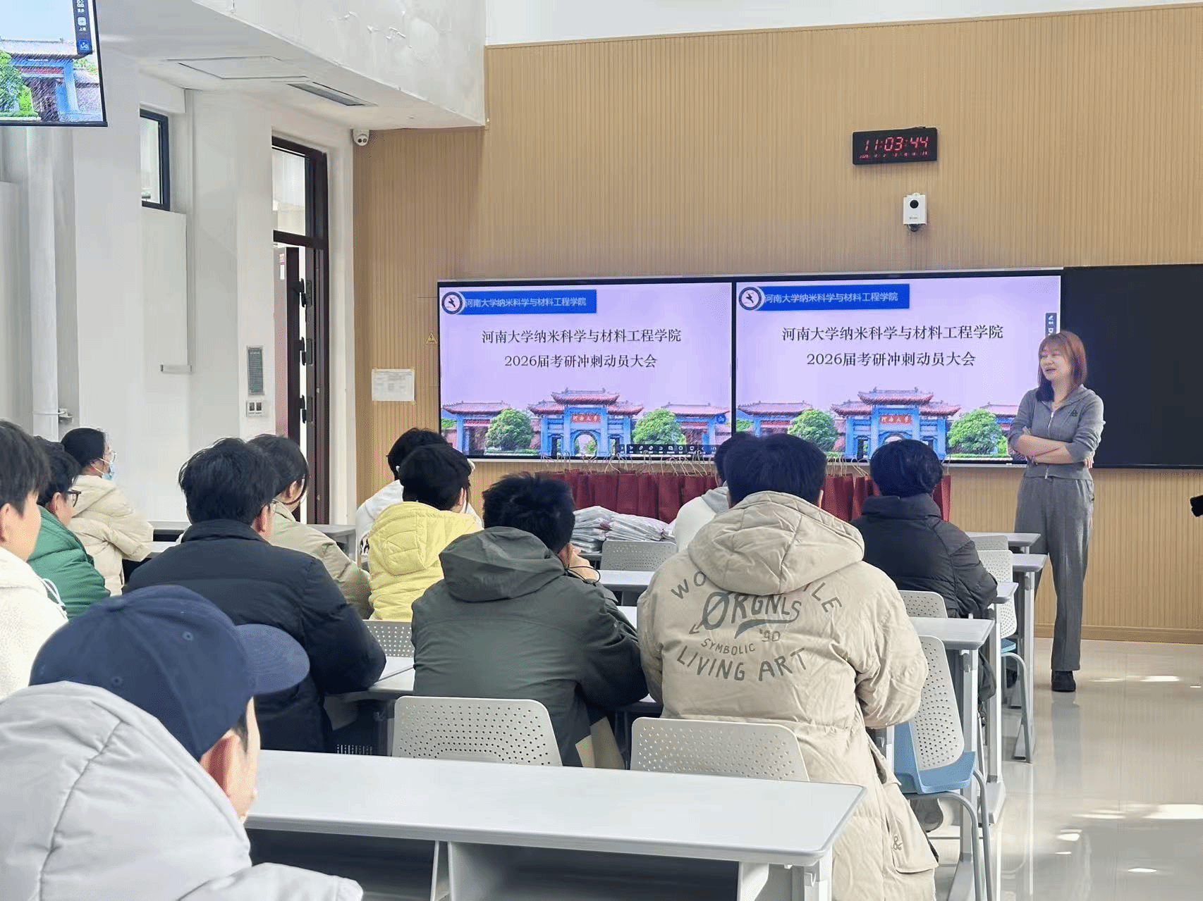 冬日砺剑,蓄势待发;“研”途护航,温暖同行。为助力2026届考研学子锚定冲刺节奏、提振备考信心,2025年12月2日,河南大学纳米科学与材料工程学院召开2026届考研冲刺动员大会。学院党委副书记石宇珺、本科生辅导员曹怡娴代表学院向即将踏上考研征程的学子们送上暖心关怀与殷切期许。