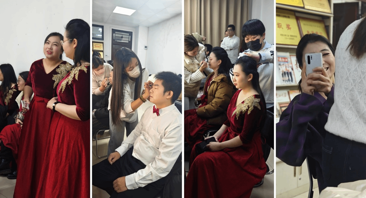 (图为赛前化妆的瞬间,老师们赛前默契协助,氛围认真而温馨)