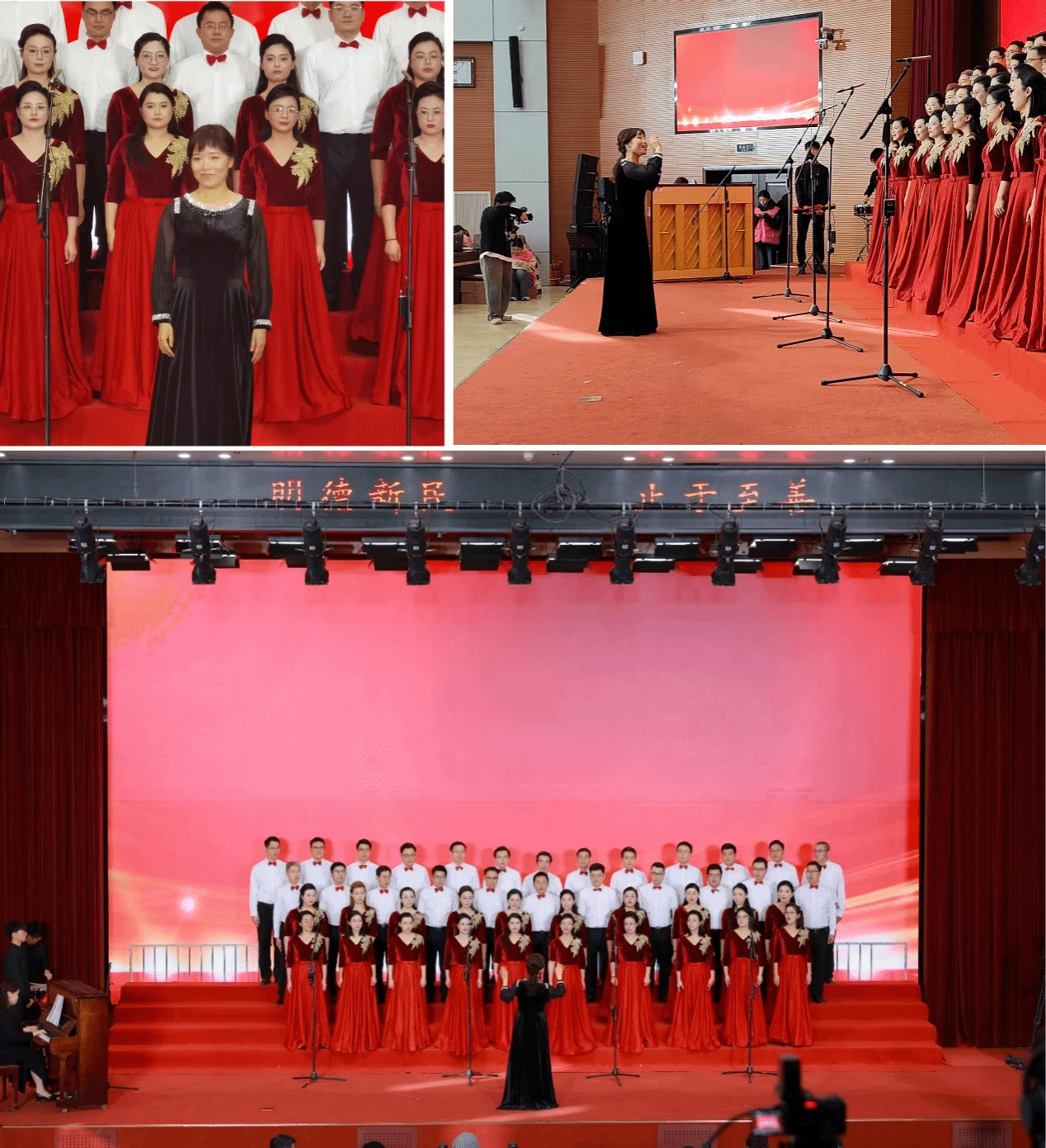 比赛当日,老师们早早抵达现场整理妆发、调整状态。红裙白衣的搭配明亮整齐,彼此整理衣妆、互相鼓励的细节中,流淌着团队特有的温暖。登台前,指导老师再次为大家校准音准与声部,确保以最佳状态投入比赛。