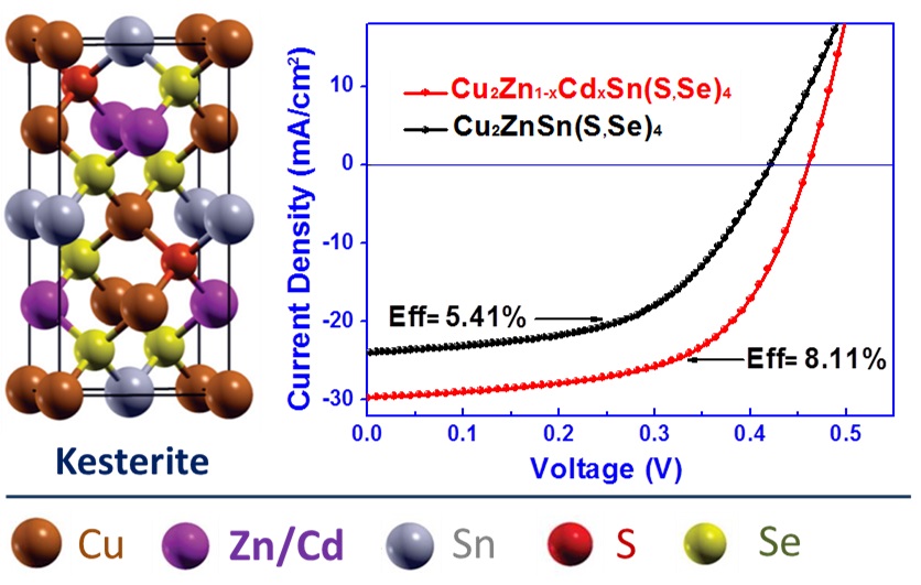 武四新课题组通过采用部分Cd2+取代Zn2+从而形成Cu2Zn1-xCdxSn(S,Se)4吸光层材料,太阳能电池的光电转换效率由5.41%提高到8.11%。该研究成果发表在Chemistry of Materials, 2016, 28, 5821−5828 (SCI一区,IF=9.407 )。文章链接: